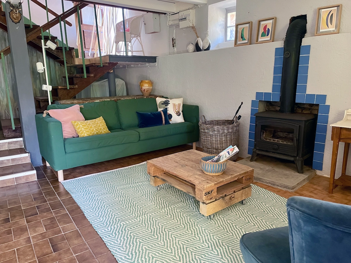 Le salon, décoré avec soin donne immédiatement sur le patio. Le feu ouvert est fonctionnel et pourra réchauffer les nuits les plus fraiches.